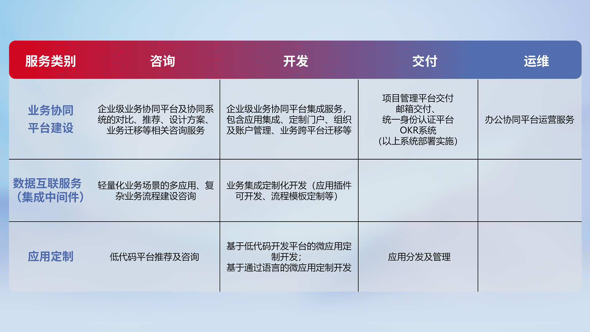 针对钉钉、、、、企微、、、、IDaas等平台级产品提供产品的规划、、方案、、、交付、、、、定制化开发等服务,,实现如统一协同办公、、、智能客户服务、、、、混合会议管理、、、、智能数据查询、、、等业务场景,,实现数字化转型。。。