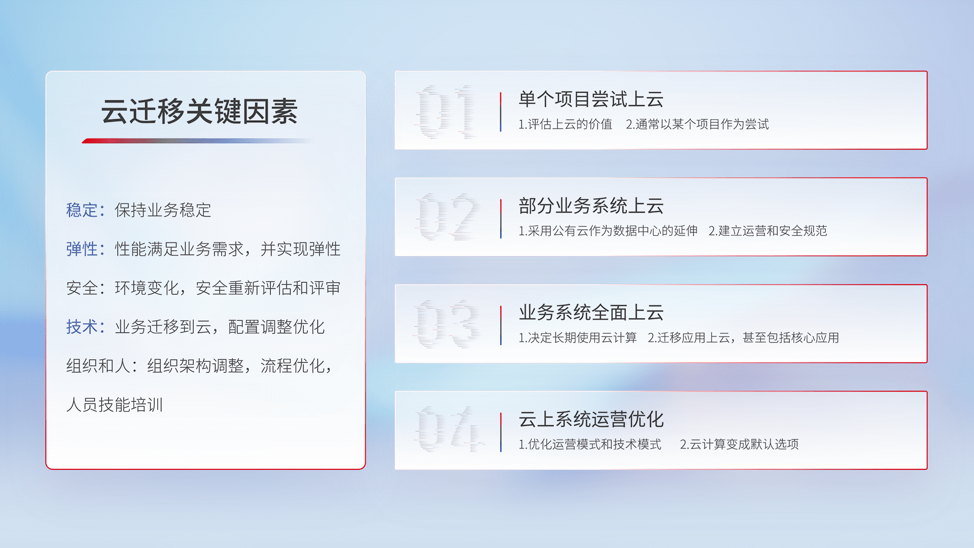 结合实际业务,,,从规划设计、、云平台选型、、、、云原生改造、、、、数据迁移、、集成交付,,,迁移全过程为客户识别最佳上云路径,,做好风险识别管理,,设计网络架构、、、身份权限、、安全审计合规、、、、操作审计、、、日志审计、、、监控告警策略、、多站点容灾设计等,,,对云上基础设施进行整体规划,,,,提升IT治理水平,,,以满足弹性、、、高可用、、、高性能的需求。。。