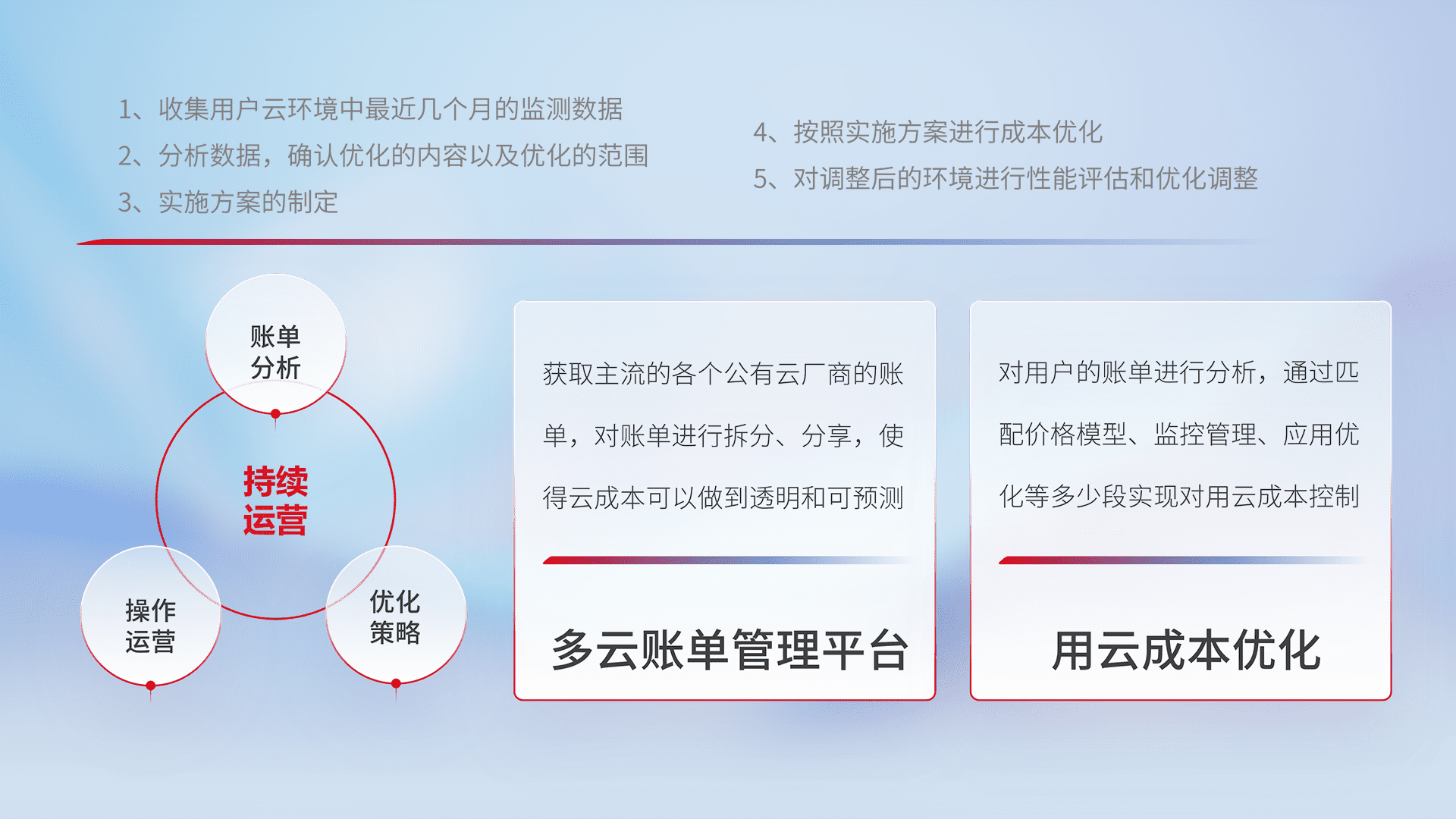 通过多云纳管,,以统一的资源数据模型把客户的云资源进行抽象和封装,,,进而实现对多云资源的统一操作,,,保障云资源管理的可靠性、、稳定性与可用性。。量身定制化运维内容,,,配置、、、开发运维、、补丁管理、、备份、、监控、、、认证和访问管理、、、、审计和日常巡检等,,,,保障在用云过程中的可靠度,,稳定度以及高可用率。。
